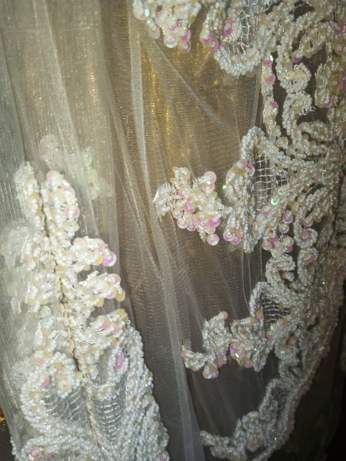 The close-up shot displays a delicate, embroidered fabric, possibly tulle or lace, adorned with intricate designs
