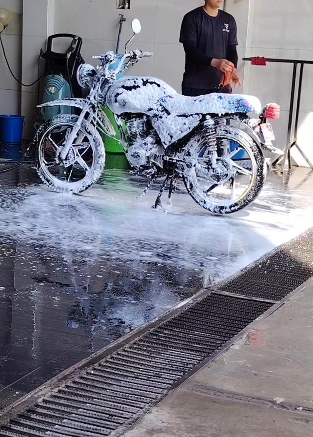 - "A man is cleaning a motorcycle in an indoor space that appears to be a car wash or garage" by FM-9E6dw2, licensed under CC BY 4.0