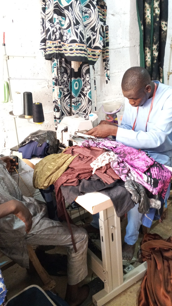 A man is seated at a sewing machine in what appears to be a tailor's workshop in Maiburiji, Nigeria