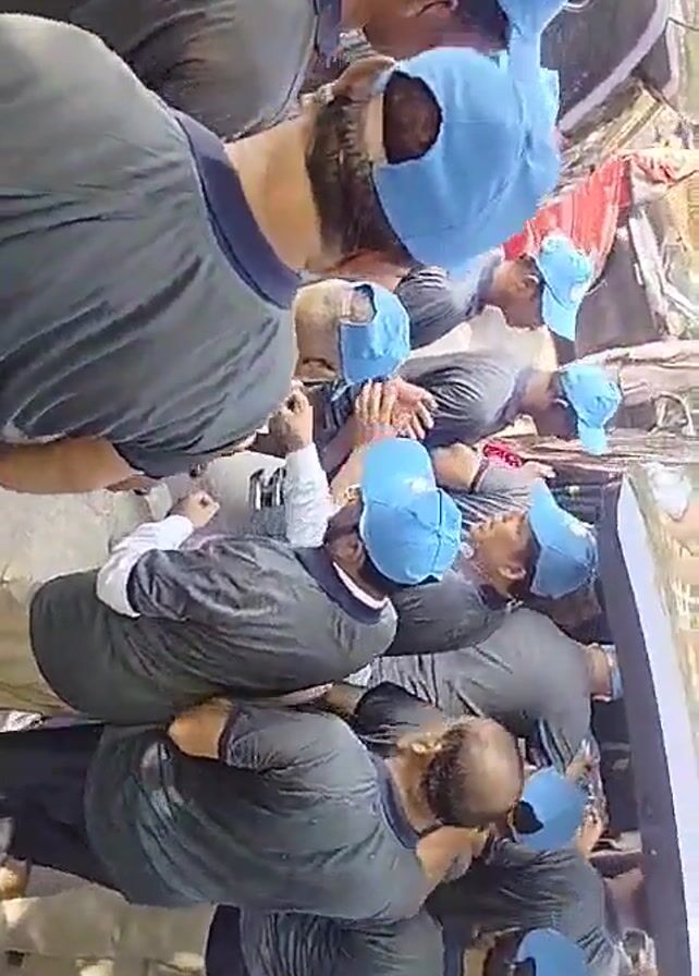 A group of about a dozen men, all wearing light blue baseball caps and mostly dressed in dark gray t-shirts, are huddled around the open trunk of a silver or light-colored car