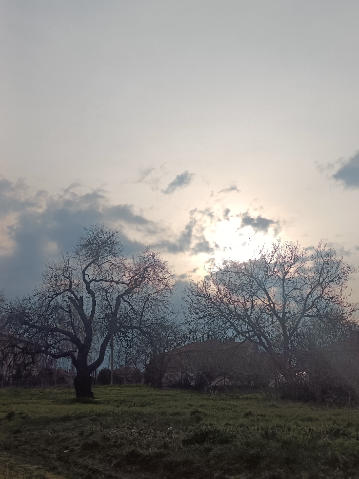 The image depicts an outdoor scene in Byala, Bulgaria, under a partly cloudy sky with a low sun. The scene is backlit, casting most foreground and midground elements into silhouette. The upper portion of the frame is dominated by a light blue-grey sky with scattered dark grey clouds. A bright, diffuse light source, consistent with the sun, is visible through the clouds in the upper right quadrant. The midground features several large, deciduous trees with bare branches, strongly silhouetted. A prominent tree with a thick trunk and extensive gnarled branches stands on the left. Small dark specks, potentially birds, are visible on its upper branches. Another significant bare tree is located on the right. Additional bare trees and bushes form a dense layer behind these main trees. In the mid-background, partially obscured by the trees and shadows, is a low-rise structure, possibly a house or barn, characterized by a dark, indistinct roof that appears thatched or heavily overgrown with vegetation. A thin, vertical structure, possibly a utility pole, is faintly visible behind the main tree on the left. The foreground consists of uneven, overgrown grassy terrain with varying shades of green and brown. No individuals are present.