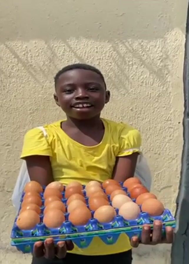 A young girl, perhaps 8 to 10 years old, stands outdoors, holding a blue and green plastic tray filled with two dozen brown eggs. She wears a bright yellow short-sleeved shirt and black leggings. A white plastic bag is visible over her shoulder. The background is a pale beige wall with dark shadows cast on it. The girl looks directly at the camera, smiles, and speaks. Her expression is cheerful and engaging.