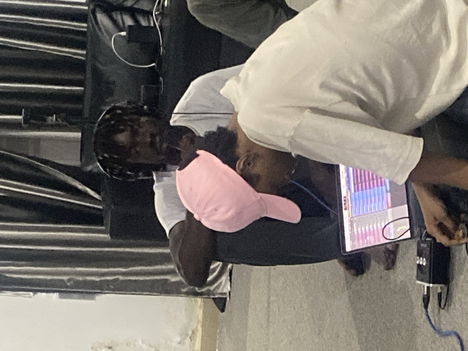In an indoor setting in Narayi, Nigeria, two individuals are present. In the foreground, positioned to the right, a person wearing a pink baseball cap and a light-colored t-shirt leans over an open laptop displaying music production software with multiple tracks. A small black audio interface is connected to the laptop via a blue cable. In the background, to the left, a second individual with dreadlocks wears headphones and a white t-shirt, dark pants, and is barefoot, sitting on the floor. This individual faces forward, seemingly observing the activity at the laptop. Behind them, a dark-colored couch is visible, along with dark, striped curtains covering a wall. A microphone stand is partially visible behind the second individual. The wall shows signs of wear.