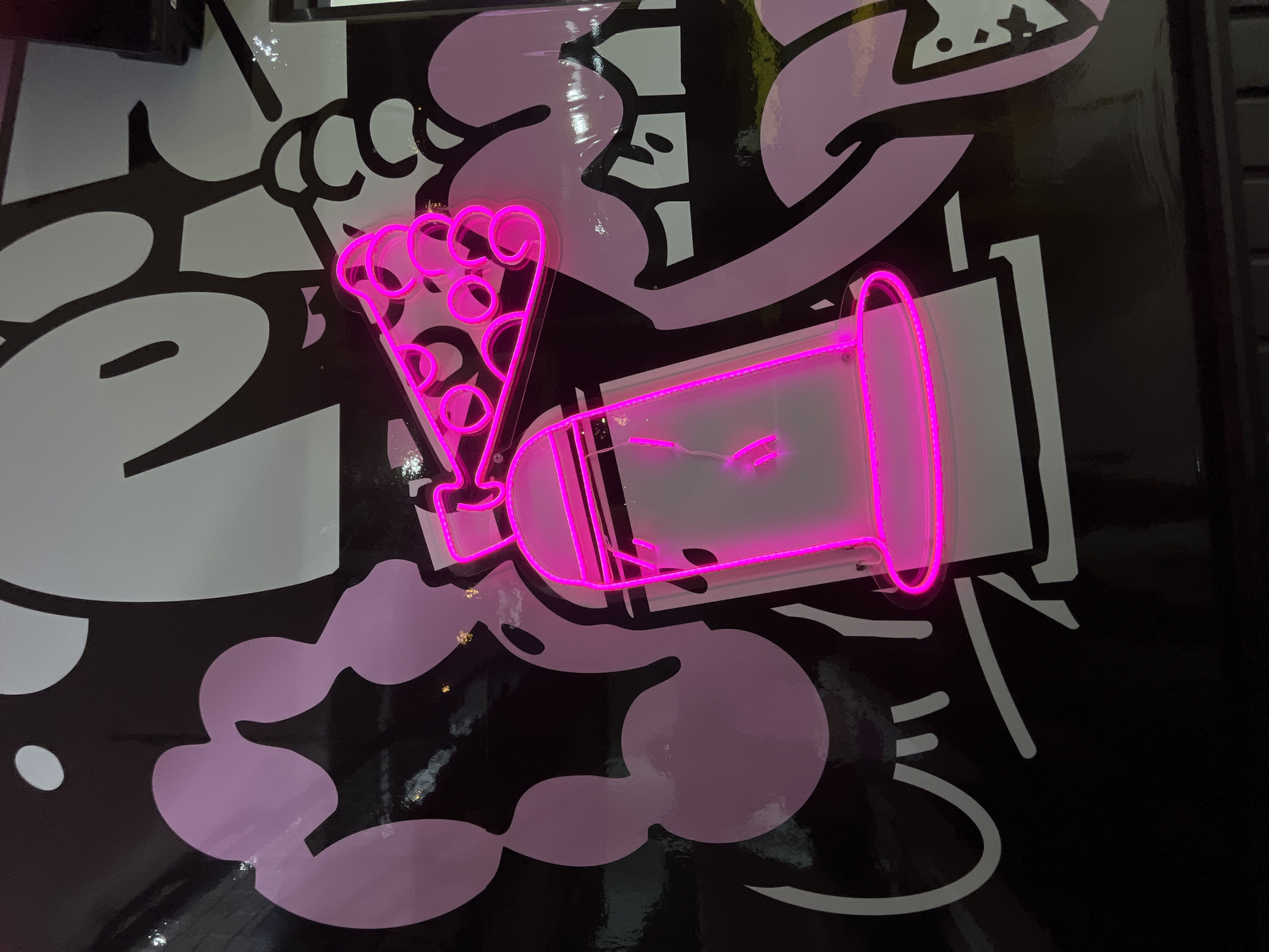 The scene is located in Arica, Chile. The image displays a bright pink neon sign mounted on a glossy surface featuring a black, white, and light purple stylized graphic. The neon sign's primary elements are a vertically oriented spray paint can with a rounded base, emitting a plume of pink neon spray, and a slice of pizza detailed with circular toppings, positioned above and to the right of the spray can. The background graphic consists of abstract, cartoon-style shapes: segmented, light purple amorphous forms are visible on the left, while black and white jagged elements, resembling a wide-open mouth or a stylized character's face, occupy the right and bottom right portions of the frame. The glossy surface reflects subtle ambient light.