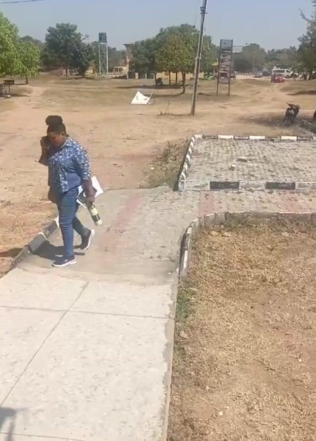 three people walking across a dry grassy area next to a paved walkway. One person is wearing a dark robe and a hat. Another person is wearing a blue patterned shirt and jeans and is carrying papers and a bottle. A third person with a backpack is walking in the same direction. The background includes trees, a water tower, signs, and vehicles in the distance. The sky is blue. The person filming the video is standing in the shade and is holding a phone.