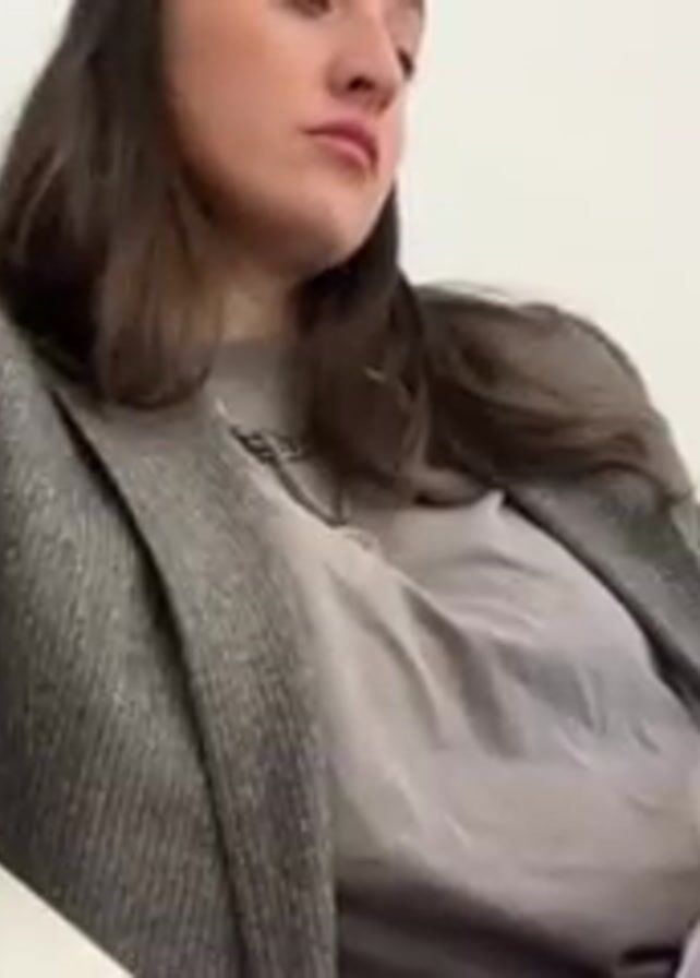 A woman is sitting and looking down at a red notebook. She's wearing a gray blazer, a gray t-shirt, and a silver necklace. The background is a white wall. She brings the notebook closer to her face and appears to be reading or studying. Her lip is tucked inward slightly. The notebook is titled "xbook".