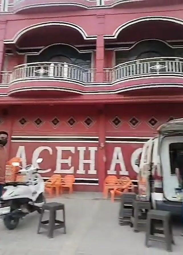 The video depicts a two-story building painted in a shade of red. The building has balconies with white railings on the second floor. The name "CEH ACEH" is written in large white letters on the ground floor of the building. A white van with its trunk open is parked in front of the building. Two men are working inside the van. A third man wearing a face mask and a reddish-brown shirt walks past the van. A white scooter is parked nearby. There are several orange plastic chairs and some black stools in front of the building. The sky is overcast. The video appears to be shot outdoors.