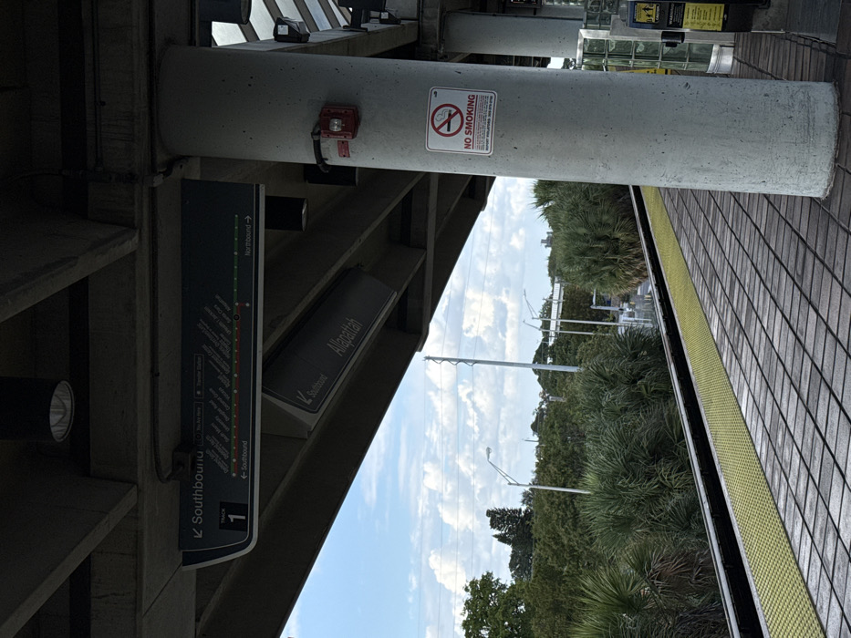 A slightly tilted view shows a train station platform. A concrete pillar is centrally located, adorned with a "No Smoking" sign. Station signage indicating "Allapattah" and "Southbound Track 1" are visible. Lush green vegetation fills the background, contrasting with the blue sky and scattered clouds. A gray, tiled platform edge with a yellow safety strip runs parallel to the greenery. Overhead structures suggest a covered waiting area.
