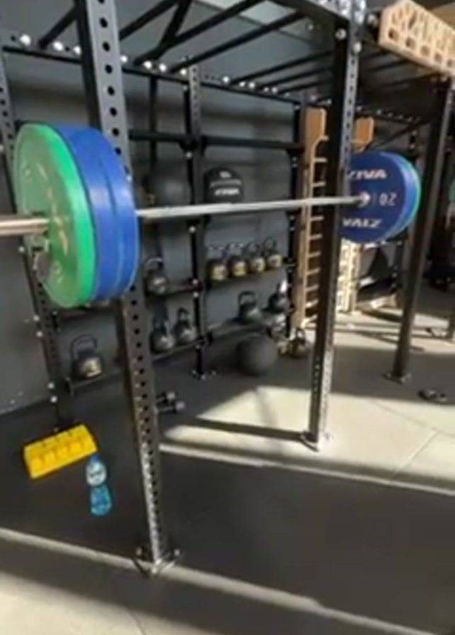 interior of a gym. In the foreground, there is a squat rack with a barbell loaded with green and blue weight plates. The gym equipment is organized and includes kettlebells, medicine balls, benches, and other workout machines. People are seen exercising in the background, some on machines and others standing. Sunlight streams through the windows, creating bright beams of light across the gym floor. The lighting is generally bright.
