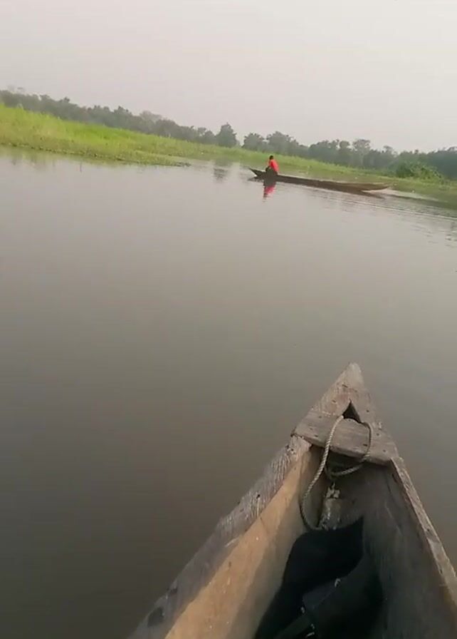 river scene. The perspective is from a wooden boat moving on the water. Another similar boat, with a person wearing an orange shirt, is further ahead in the middle of the river. The banks of the river are covered with green vegetation and trees. The sky is overcast. The water is calm and reflects the sky. The foreground shows the front part of the boat from which the video is being taken, with a rope and a dark bag visible inside. A few birds can be seen flying in the distance. The camera briefly blurs.