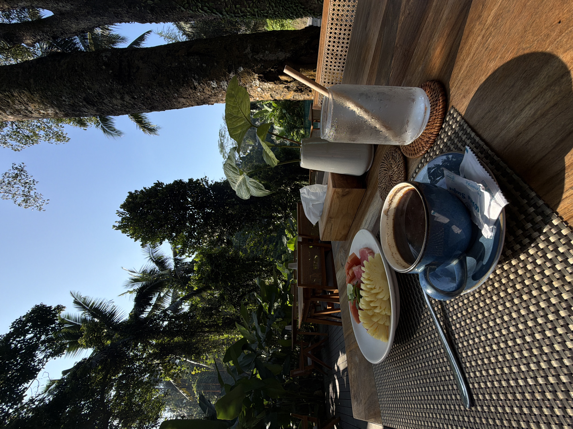n outdoor breakfast setting in Kedewatan, Indonesia. A wooden table holds a cup of coffee, a plate with sliced pineapple and watermelon, a tall glass of water, and a small potted plant. Sunlight illuminates the setting. Lush green foliage and trees surround the table. The sky is clear and blue.