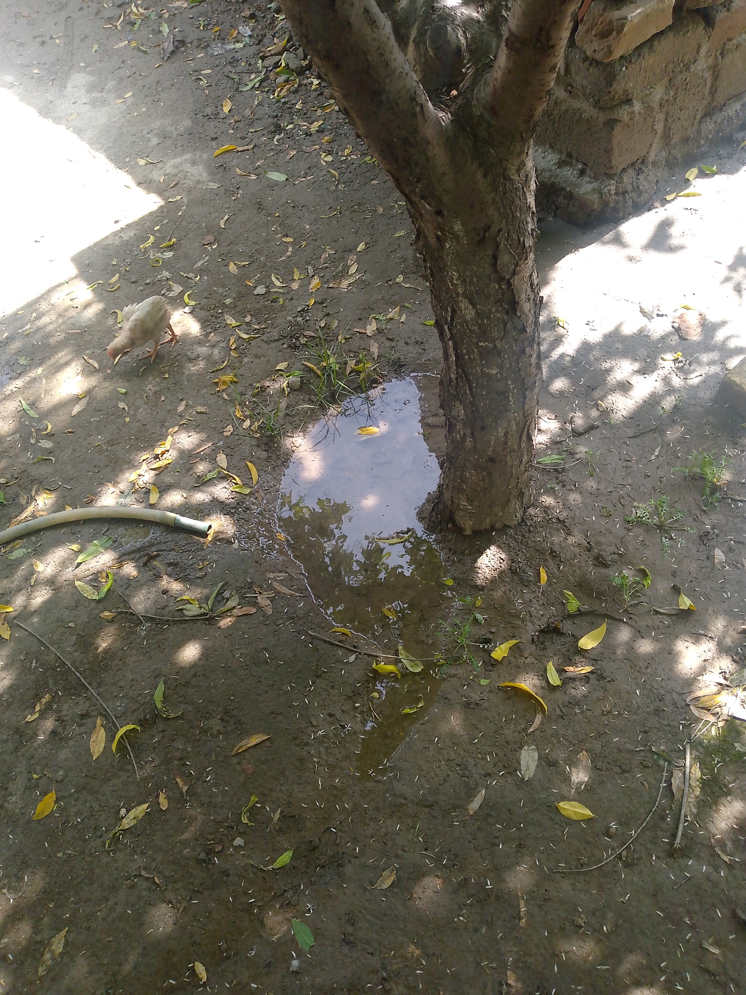 A medium, outdoor shot shows a muddy area with fallen leaves and a tree trunk in an unknown location in the city of Unknown, Unknown. The muddy area appears to be a pool of water surrounding the base of the tree. The tree trunk is thick and textured, with branches extending from it. In the background, there is a brick structure or wall. A garden hose lies on the ground to the left of the tree trunk, and a small, pale bird is foraging near the hose. The environment is natural, with mud, water, leaves, and greenery suggesting a garden or yard. The lighting is bright, casting shadows on the ground around the tree.