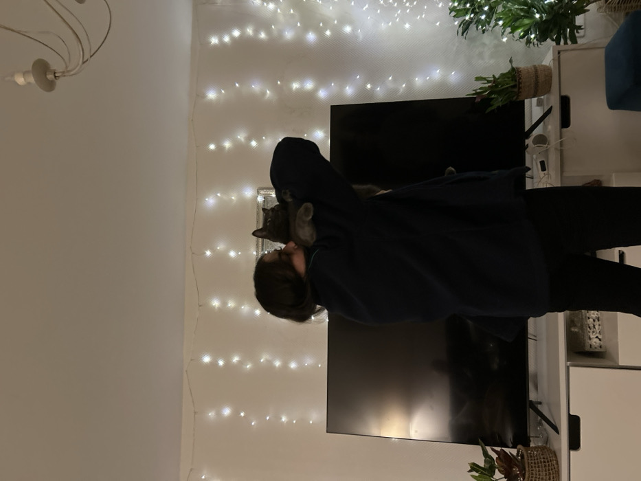 A woman in a dark blue hoodie bends down to kiss a gray cat sitting in front of a mirror on the wall. The wall is decorated with string lights. Behind the woman, a large black television sits atop a white cabinet. Several potted plants sit on the cabinet and floor. The image is rotated counterclockwise, giving the impression of a sideways perspective.