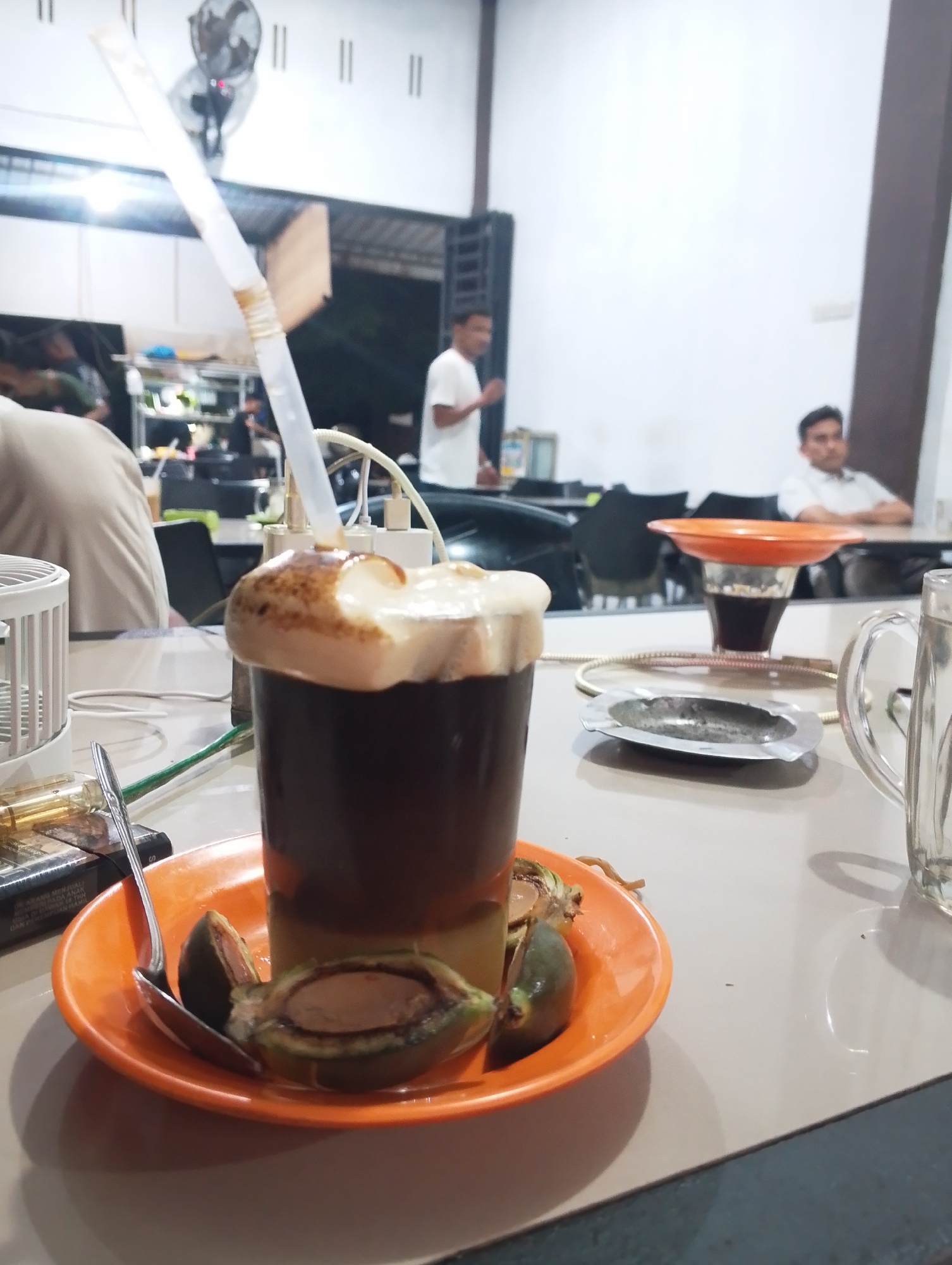 The image captures a scene indoors, likely a cafe or restaurant in Cotseutui, Indonesia. Dominating the foreground is a dark beverage, possibly coffee, in a tall glass with a thick, light-colored foam on top and a clear straw extending upwards. The glass sits on a small orange plate alongside a few cut fruits and a spoon. In the immediate vicinity, there's a cigarette pack, a lighter, and a small silver ashtray. Further away, there is a glass pitcher. In the midground, a man is seated at a table wearing a white shirt. Another man, also in a white shirt, is standing further in the background. Several tables and chairs are visible, along with other patrons in the background. The environment is illuminated by artificial light. The walls are painted white. A fan hangs on the wall. The atmosphere appears casual. The focus of the image is the drink and the items immediately surrounding it.