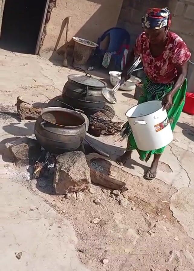 A woman is cooking outdoors. She is wearing a red floral shirt, a green and white skirt, and a head wrap. She is pouring liquid from a white bucket into a large black pot over a wood fire. There are two more large black pots nearby, one of which has a lid. The cooking area is a concrete surface surrounded by a building with a doorway and a variety of containers. The scene is brightly lit by sunlight.