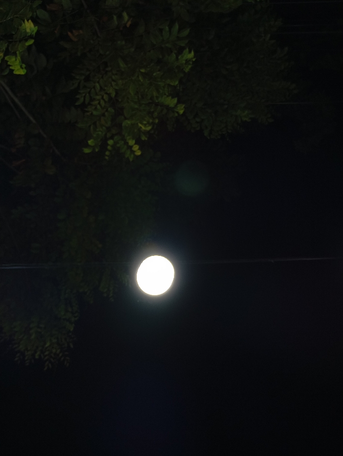 The image depicts a nighttime outdoor scene in Lhokseumawe, Indonesia. A single, bright circular light source, consistent with a streetlamp, is centered in the mid-left portion of the frame. Above this light, a thin, dark horizontal line, identifiable as an electrical or utility cable, extends across the upper-mid section of the image. The upper-left quadrant and left edge are occupied by dark green foliage, indicative of a tree canopy, dimly illuminated by the artificial light. The remainder of the background is uniformly dark, consistent with a night sky. A faint, soft green-blue lens flare is present below the foliage in the lower-mid-left area. No individuals or specific actions are discernible.