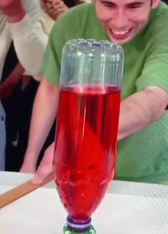 - "A group of young adults is gathered around a table, observing an upside-down plastic bottle filled with red liquid" by FM-iVQs23, licensed under CC BY 4.0