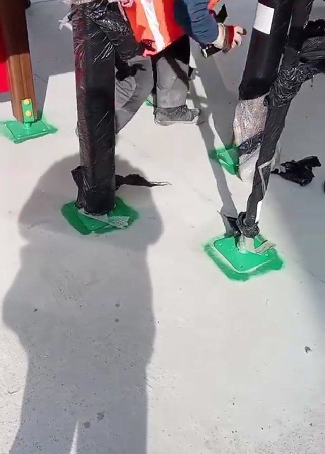worker wearing a safety vest and a beanie inspecting a children's playground structure that is partially covered in black plastic and bubble wrap. The structure has a spiral climbing feature and other elements, all supported by poles with green bases. The playground is located on a concrete surface in front of a tall white building with multiple windows. The worker is bending over, seemingly examining the wrapped parts of the structure. The surrounding area appears to be a construction site or newly developed area. The camera pans up to show the full height of the playground structure and the nearby building.