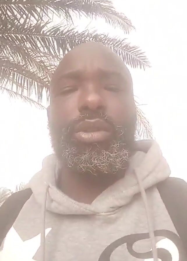 A person with a shaved head and a beard is wearing a gray hooded sweatshirt with a black design. The person is standing outdoors beneath a palm tree against a bright sky. They are looking directly at the camera with a serious expression. A backpack is visible.