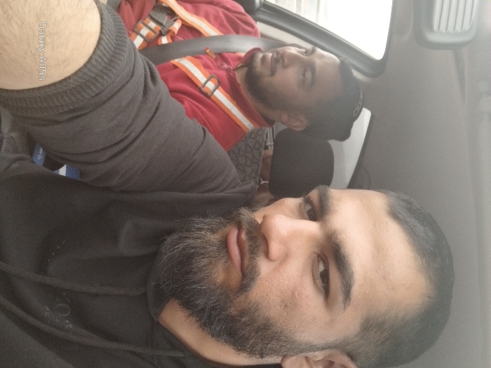 Two adult males are observed inside the passenger compartment of a vehicle, positioned in what is identified as Vrachesh, Bulgaria. The image is captured from a close-up, slightly low angle, indicative of a selfie or a shot taken by the subject nearest the camera. In the foreground, on the right side of the frame, is a male subject with dark hair, a closely cropped beard with visible grey strands, and dark eyes. He possesses prominent eyebrows and exhibits minor facial blemishes on his forehead and right cheek. He wears a dark, possibly black, hooded sweatshirt with visible drawstrings and a ribbed cuff on his left sleeve. His gaze is directed towards the camera. In the mid-ground, on the left side, another male subject is visible, seated behind the foreground individual. He has dark hair, a short dark beard, and is potentially wearing a dark cap or beanie. He is dressed in a red long-sleeved shirt with a collar closure, over which an orange and white multi-strap harness system is worn. A black seatbelt is visible across his torso. This subject is looking towards his left, away from the camera, presumably towards a window. The interior of the vehicle shows parts of the roof liner and a rearview mirror at the top. A blurred exterior view, possibly from a window, is visible on the left. A dark headrest is behind the mid-ground subject, and a patterned object is partially visible further back. The photo was captured with a "Galaxy A05s" device, as indicated by a watermark in the bottom left corner.