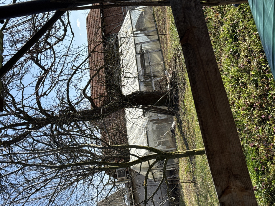 The scene, located in Gorna Grashtitsa, Bulgaria, depicts an outdoor area, likely a residential property or plot of land, under a clear blue sky. In the lower foreground, a dark brown wooden board extends diagonally, partially obscuring ground cover composed of green grass and small patches of purple flowering plants. The midground features several leafless deciduous trees with bare branches silhouetted against the sky. A rectangular greenhouse, constructed with a translucent white plastic sheeting over a visible frame, occupies the central midground and exhibits signs of wear, including some sagging of the covering. In the background, multiple structures are discernible: a building with a reddish-brown tiled roof is prominent, and to its left, a lighter-colored building with an external unit mounted on its wall is partially visible. No individuals or specific actions are depicted within the frame.
