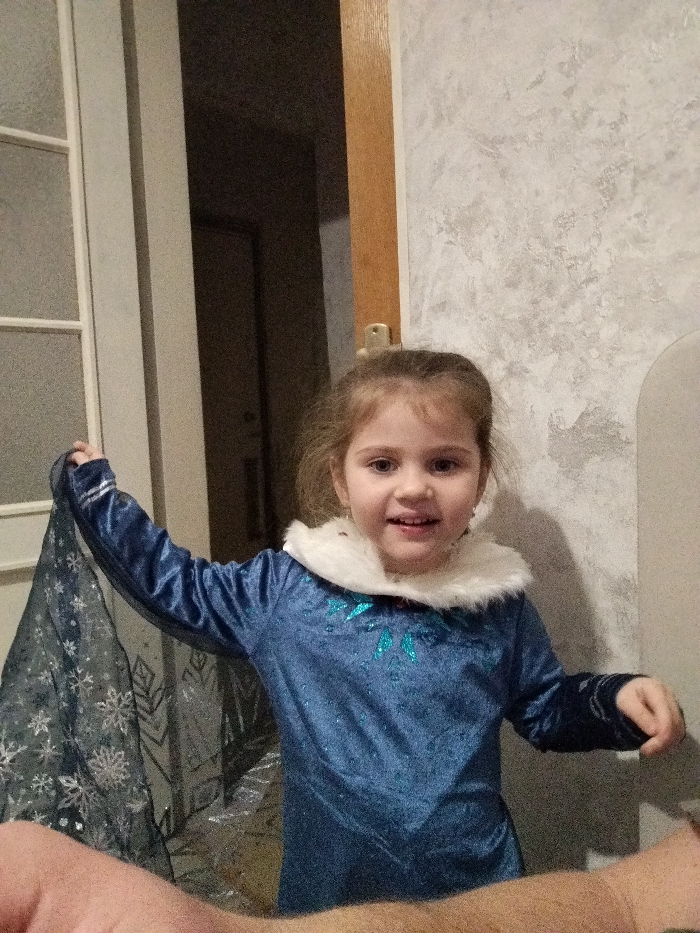 A forward-facing photograph captures a young female child, estimated between three and six years of age, smiling directly at the camera. She possesses light brown hair pulled back from her face. The child is dressed in a long-sleeved, glitter-textured blue dress adorned with light blue snowflake-like embellishments on the chest and a white faux fur collar. A sheer, dark blue cape with silver snowflake patterns is held by her raised left hand, draped over her left arm. Her right arm is bent at the elbow, hand partially visible. The bottom portion of the image displays segments of two light-skinned adult forearms. The background consists of a light-colored doorframe with a translucent paneled door on the left, an intervening vertical wooden door jamb featuring a metallic strike plate, and a light gray textured wall on the right. A dimly lit interior space is visible beyond the doorway. The scene is an undetermined indoor location.