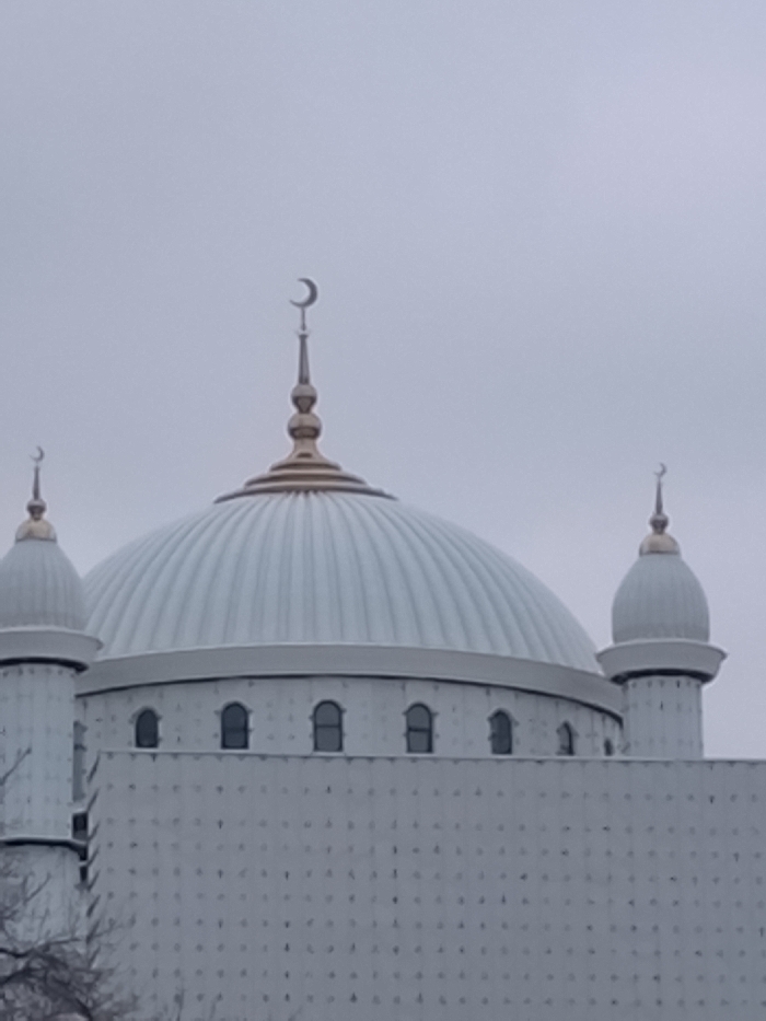 The image displays a partial exterior view of a mosque in Syrdarya, Uzbekistan, against an overcast, light grey sky