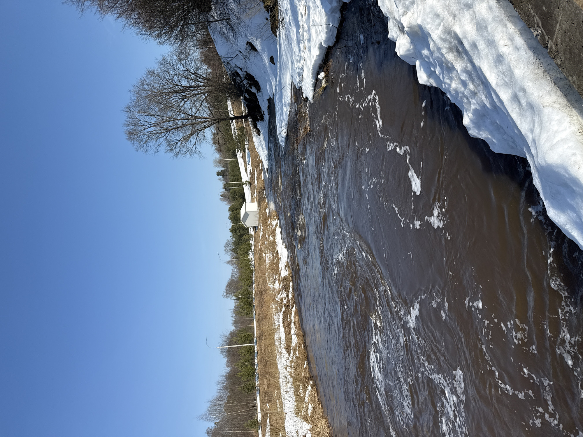 This image depicts an outdoor scene in Demino, Russia, under a clear, bright blue sky. A dark brown, turbulent river occupies the lower and middle sections of the frame, flowing from the foreground towards the background with visible white foam patterns on its surface, indicating current. The left bank features a gradual slope covered in patches of melting snow and dry, brown vegetation. In the mid-distance along the left bank, a line of bare deciduous trees and green coniferous trees is present, interspersed with multiple white streetlights. A small, white, gabled building stands on the left bank further back. The right bank is steep and heavily covered in white snow, revealing some darker bare earth or vegetation. Several leafless deciduous trees rise along the top of this snow-covered bank. A thick accumulation of white snow and ice extends from the bottom right foreground into the river, bordering a dark, solid structure. No individuals or animals are visible within the frame.
