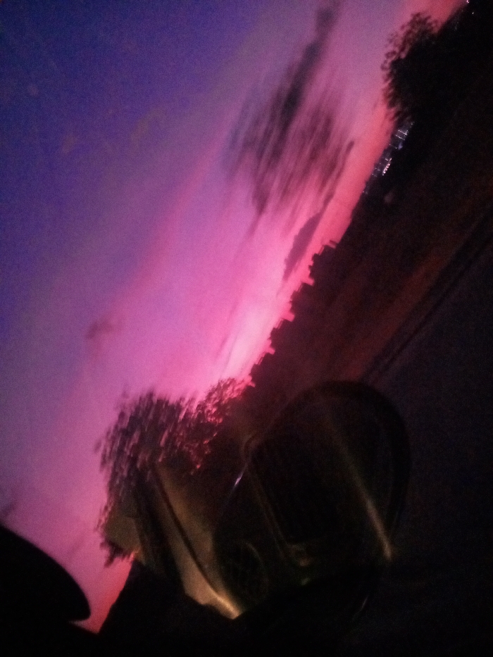 A vibrant pink and purple sunset fills the sky, visible from what appears to be inside a vehicle. Silhouetted trees and distant city lights are seen along the horizon. The interior of the vehicle is dark, with shapes suggesting a headrest and possibly the car's door. The image is angled, giving a dynamic, slightly blurred perspective of the colorful sky.