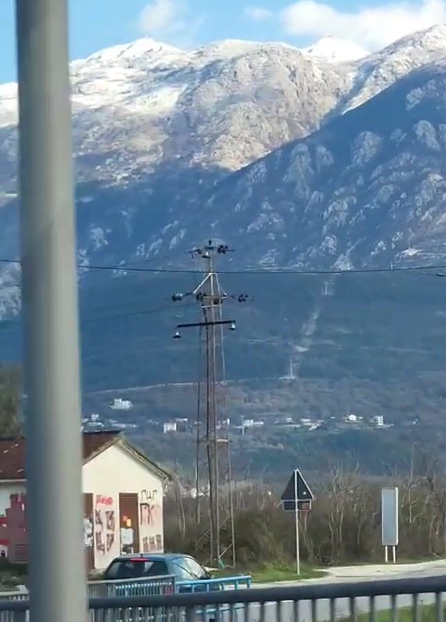 view from inside a moving car. Outside, there is a mountainous landscape with snow-capped peaks under a clear blue sky with scattered clouds. In the foreground, there are roadside elements such as a white utility pole, a road sign, and some vegetation. As the car moves, the view is briefly obscured by something inside the car, possibly a person's headrest or hair. The car is traveling on a road with a metal guardrail visible through the window. In one instance, a small building with graffiti is visible next to the road.