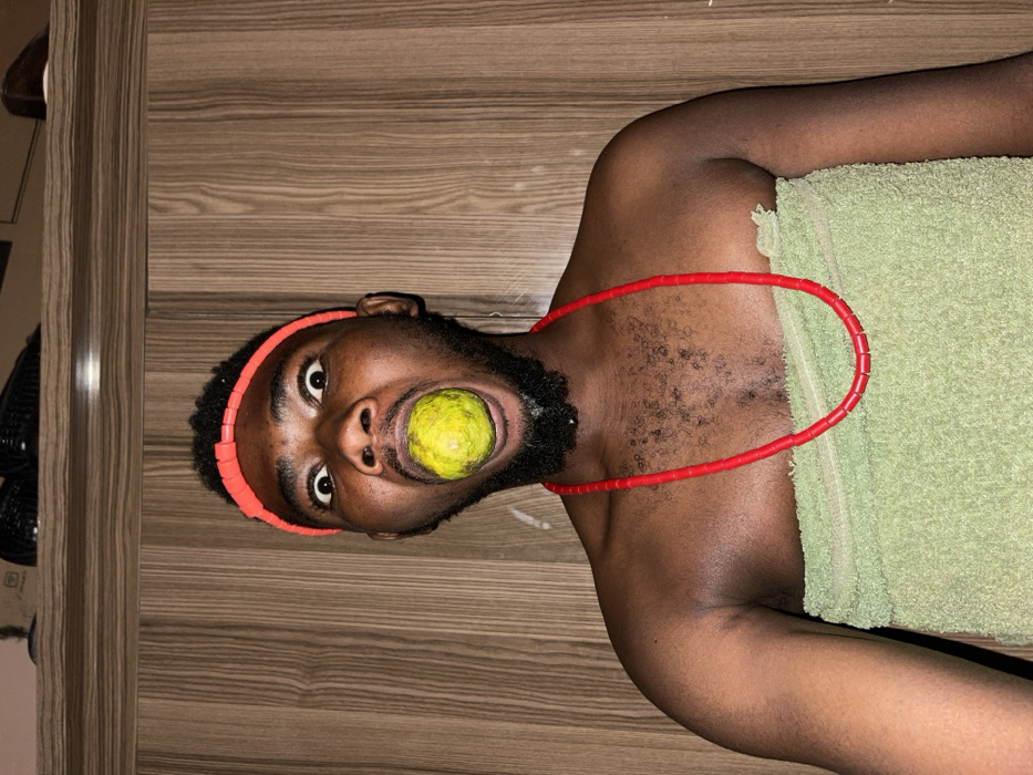 An adult male is captured in a close-up, chest-up indoor shot in Muchiya, Nigeria. The subject, with dark skin, dark hair, and a beard, is facing the camera directly. His eyes are wide, and his mouth is agape, encompassing a spherical, light green object, resembling a lime or small fruit. He wears a red beaded headband across his forehead and a long red beaded necklace around his neck. A light green towel is wrapped around his lower torso, partially visible. The background consists of vertical light brown wood paneling, likely a wall or a wardrobe. Above the subject's head, dark objects are visible on a shelf or surface.