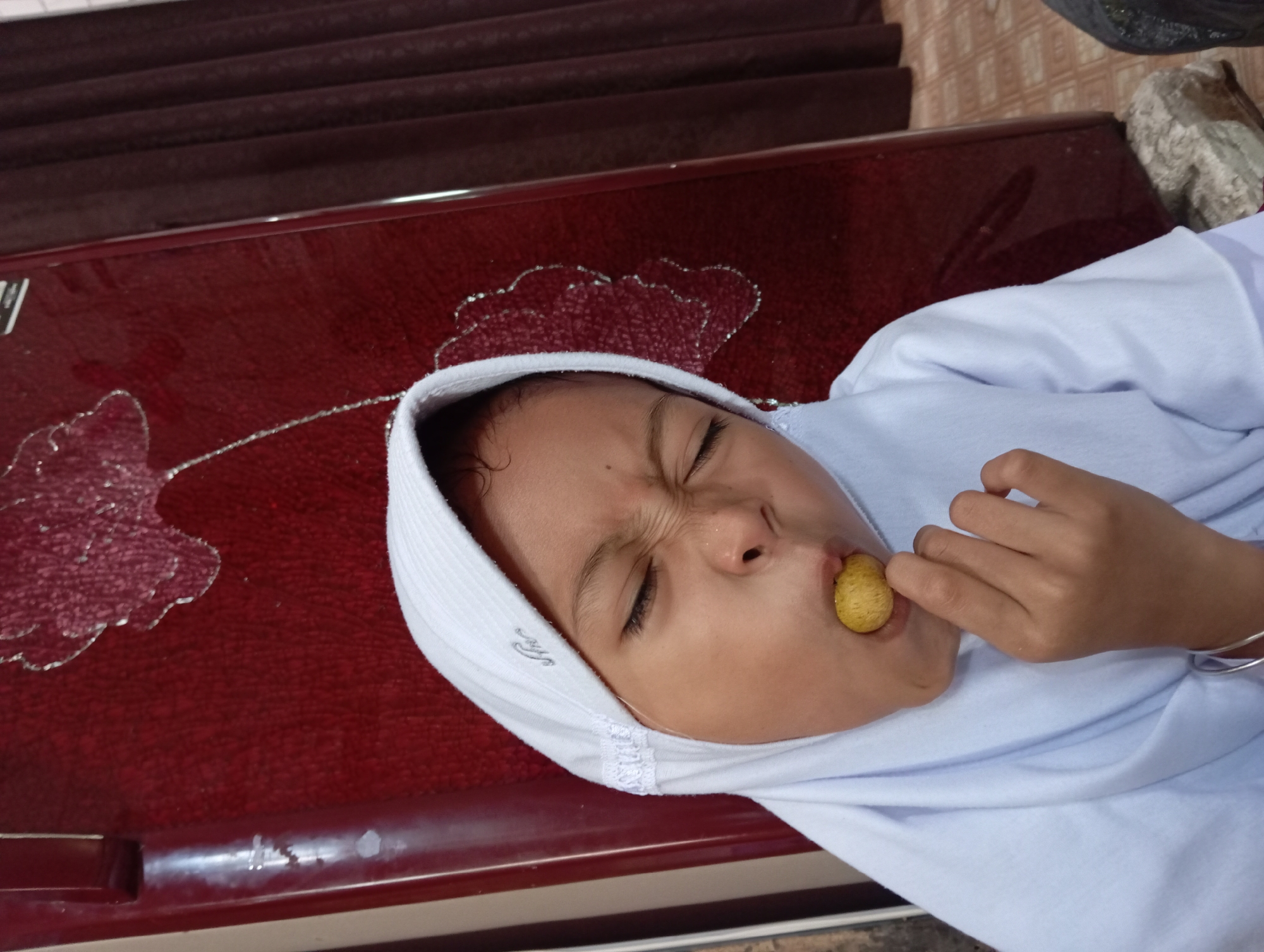 A young child wearing a white headscarf is lying on a red surface, possibly a bed or a table with decorative silver patterns. The child has a small, yellow, oval-shaped object in their mouth and is grimacing with their eyes closed and nose wrinkled. The child's right hand is near their face. The environment includes a piece of decorative stone and a glimpse of tiled flooring. The location is Baron, Indonesia.