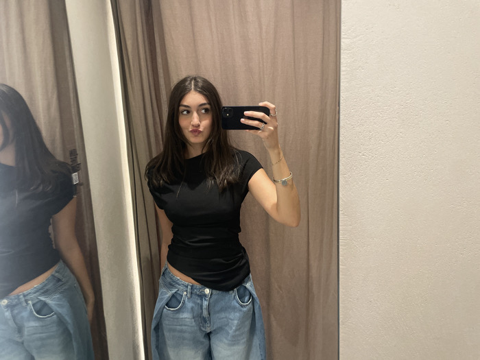 A young female is depicted in a fitting room within a retail store in Montpellier, France, taking a mirror selfie. The subject has long, dark brown hair and is wearing a black, short-sleeved top and light blue, loose-fitting denim pants. She holds a black smartphone in her right hand, positioned to capture her reflection in the prominent mirror that occupies the left portion of the image. Her left hand displays two rings on the index and middle fingers, while her right wrist is adorned with multiple silver-toned bracelets. Her facial expression shows pursed lips. The immediate background behind the subject's reflection consists of a light brown curtain, consistent with fitting room dividers, and to the right of the mirror, a plain, textured, light cream-colored wall is visible.