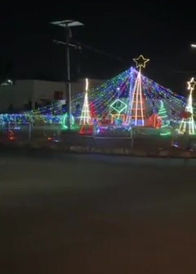 street at night with Christmas decorations set up in a median or small traffic island. The decorations include several stylized Christmas trees made of lights in red, green, and white. A large star sits atop the tallest tree. Strings of multi-colored lights are draped from the star down to the edges of the display, creating a canopy effect. There's also a lit-up cube shape. A low metal fence surrounds the decorated area. A utility pole with a solar panel is visible on the left side of the frame. The road is dark and empty. The background is dark, with some buildings barely visible.