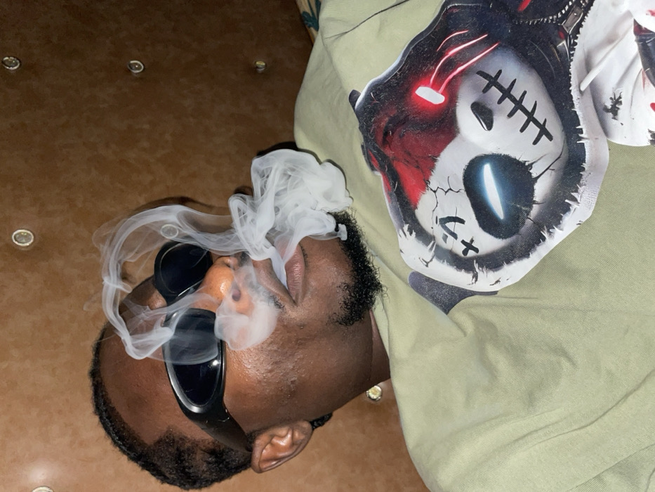 A man with dark skin and a beard is exhaling a cloud of white smoke. He wears dark sunglasses. The man is lying on a brown surface studded with metal accents and wearing a light green shirt. The shirt has a cartoon design on it with a red and white color scheme. The image is composed from a high-angle perspective, looking down on the man.
