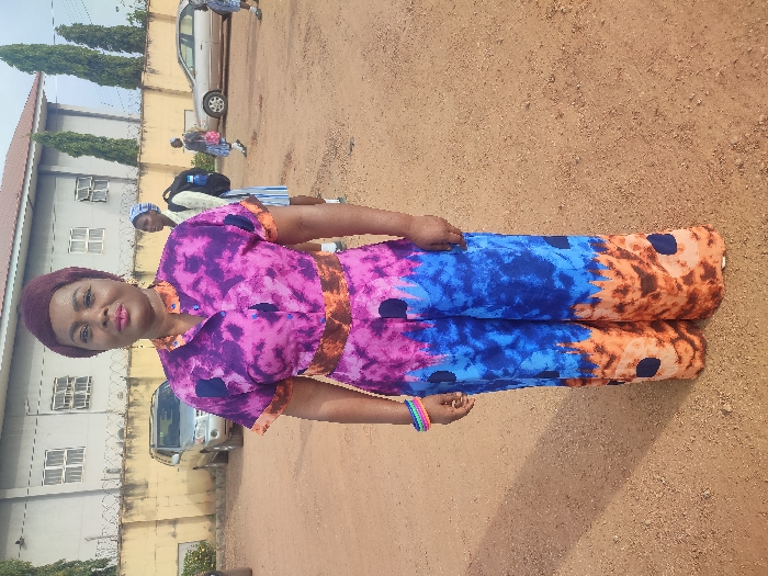 The image depicts an outdoor scene, likely a school campus or institutional area in Barden Yana, Nigeria. In the foreground, a female subject stands facing the camera. She wears a multicolored tie-dye jumpsuit featuring purple and pink patterns on the top section, an orange-brown solid belt, and blue patterns transitioning to orange-brown patterns on the wide-leg pants. Her dark reddish hair is styled with a headwrap, and she has long dangling earrings. Multi-colored beaded bracelets are visible on her left wrist. In the mid-ground and background, several individuals, appearing to be students in uniform, are present. One female student with a dark backpack stands behind the primary subject, looking towards the right. Other students are further to the right, near parked vehicles. The ground consists of reddish-brown unpaved earth. Behind the subjects, a light-colored concrete building with multiple windows and a reddish-brown tiled roof is visible. A lower yellow-painted wall topped with barbed wire runs across the background, separating the immediate foreground from the main building. A silver SUV is parked behind this wall to the left, and a lighter-colored sedan is parked further right. Several tall, slender evergreen trees are visible behind the wall on the right. The sky is overcast.