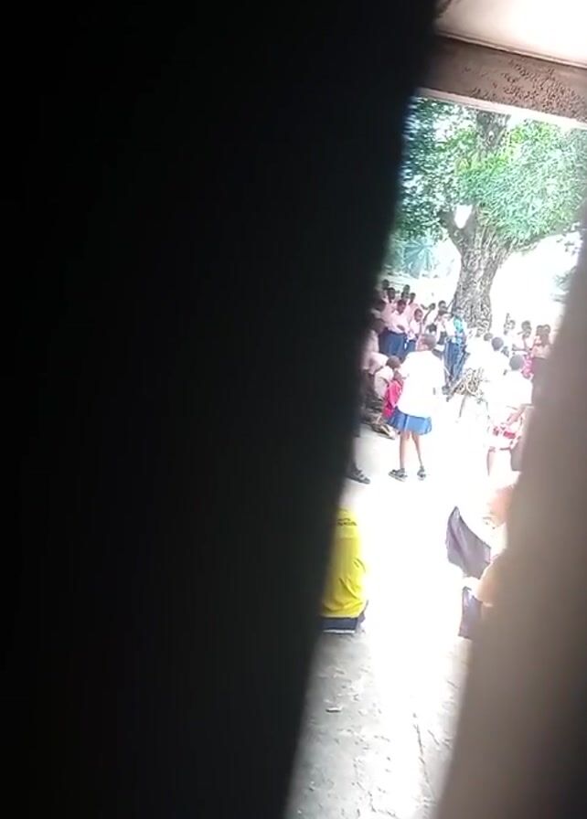 Through a narrow opening, a group of people is gathered outside, appearing to be at a school or similar institution. Most are wearing white tops, with some in shorts or skirts, indicating uniforms. Some are standing while others are sitting on the ground. A large tree is visible in the background. The view is partially obstructed by a dark, vertical structure on the left and a lighter one on the right.