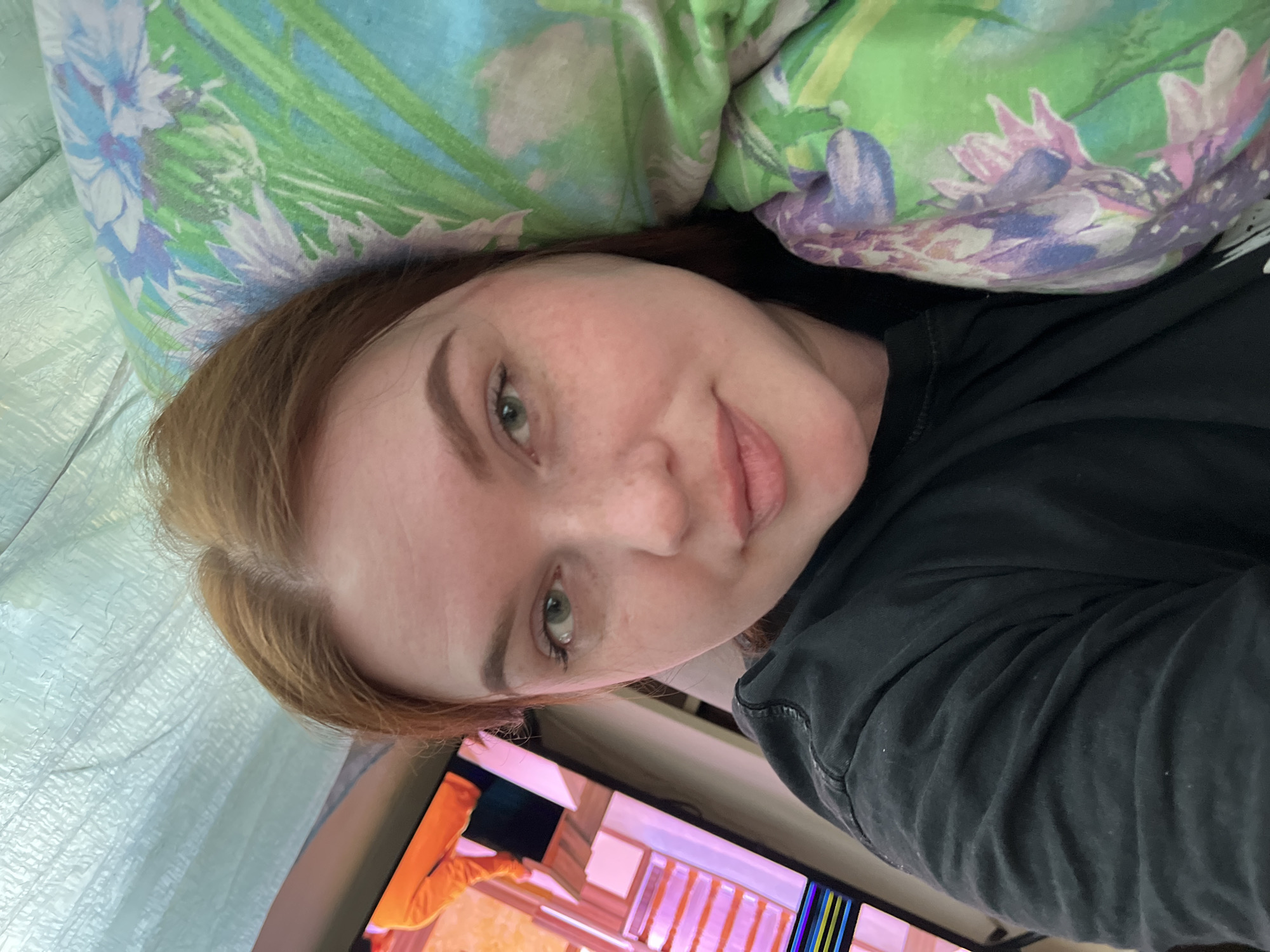 An indoor scene depicts a female individual, observed from the chest up, lying down and facing the camera. She has light reddish-brown hair, green eyes, and visible freckles on her face, with light makeup accentuating her eyebrows and lips. She wears a dark, likely black, short-sleeved t-shirt and displays a neutral expression with a slight, closed-mouth smile. Her head rests on a pillow to her right, which features a floral pattern in shades of green, blue, and purple. To her left, in the background, a television screen is visible, displaying an image with prominent orange and pink elements, and a horizontal band of multicolored (blue, yellow, magenta, black) static or error bars at its lower left edge. Above and behind the individual, a light-colored, textured material, possibly a crinkled sheet or tarp, forms a covering or ceiling. The specific location within the city of Павловка, Russia, is not discernible from the visual evidence presented.