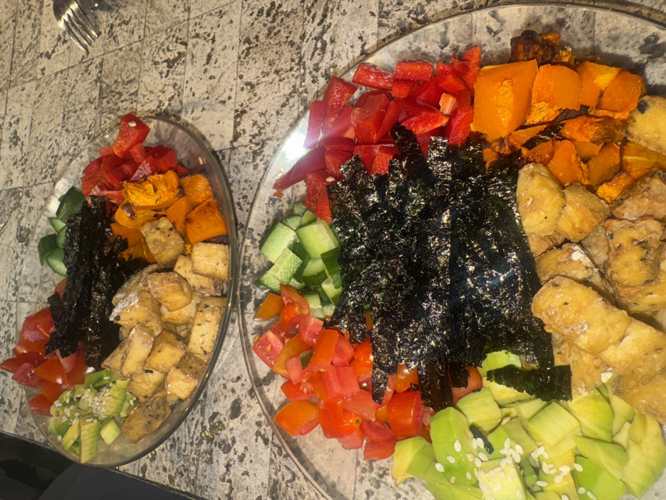 Two transparent circular glass plates, each containing a prepared meal, are situated on a speckled light gray and brown countertop. The larger foreground plate displays an arrangement of distinct food components: diced red tomatoes, diced green cucumbers, fragmented dark green nori seaweed, sliced light green avocado topped with white sesame seeds, cuboid pieces of golden-brown fried or baked tofu, roasted orange sweet potato or butternut squash cubes, and diced red bell pepper. The background plate, positioned slightly behind and to the left, is similar in composition and arrangement but appears less distinct due to focus. A silver metal fork handle is partially visible on the right edge of the image, resting on the countertop. The scene is illuminated, creating reflections on the plate surfaces and seaweed. This scene is located in Bnei Atarot, Israel.