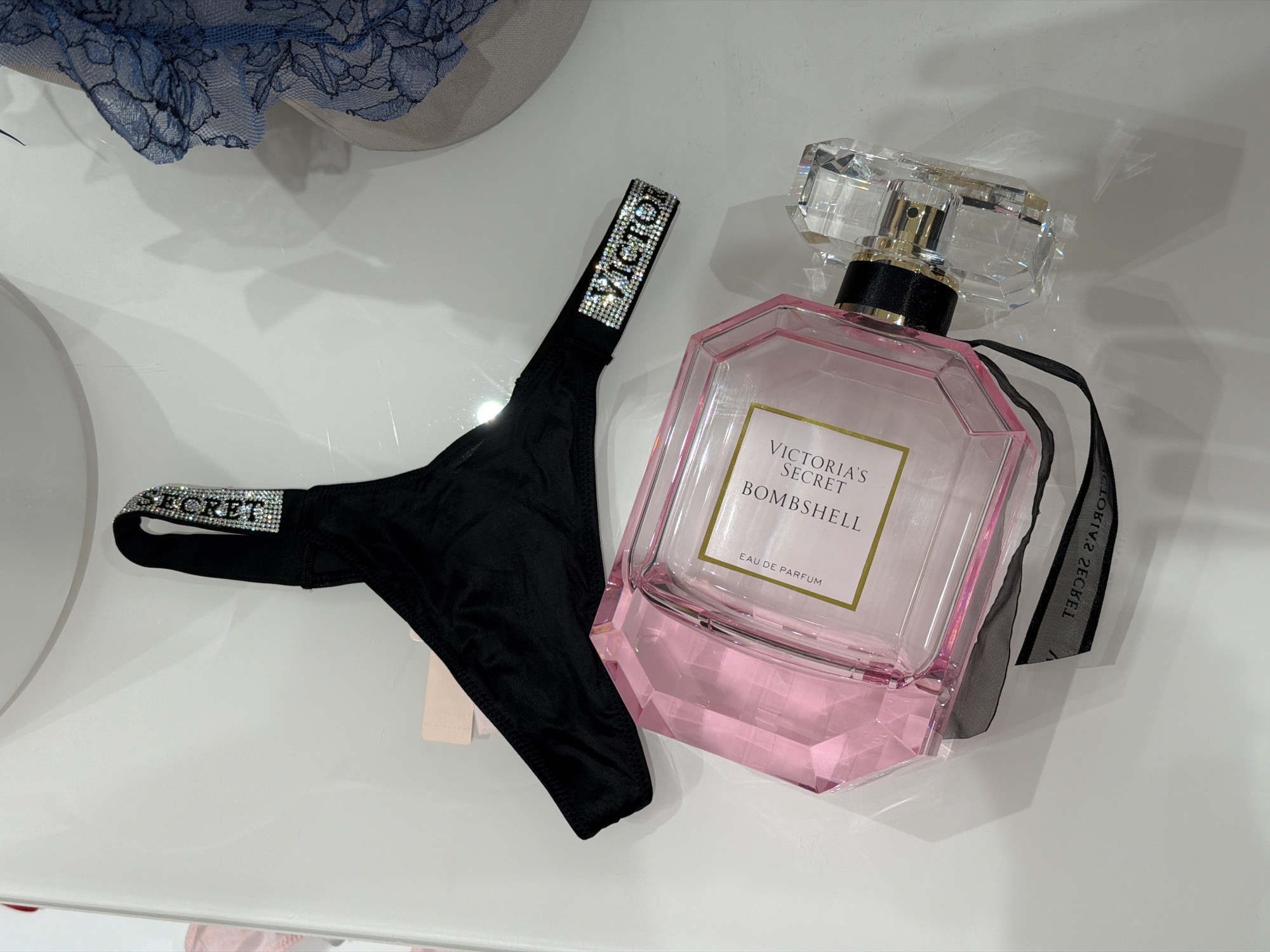 The scene is situated in Valencia, Spain. The image displays a flat lay of retail items on a bright white, reflective surface, likely a display counter. A black thong with a rhinestone-embellished waistband is positioned towards the top-center, oriented with its front portion facing downward. The rhinestones on the waistband clearly spell "VICTORIA'S SECRET," with "VICTORIA" visible on the right side and "SECRET" on the left. Below and slightly to the right of the thong, a large, rectangular, faceted pink perfume bottle lies on its side. The bottle's label, oriented horizontally, reads "VICTORIA'S SECRET BOMBSHELL EAU DE PARFUM." The perfume bottle has a clear, faceted cap with a black and gold neck. A black ribbon with "VICTORIA'S SECRET" text in white is partially visible beneath the lower-left edge of the perfume bottle. In the upper-right corner of the image, a light-colored object, possibly a mannequin or display prop, is partially visible, adorned with intricate blue lace featuring a floral pattern. The lighting is bright and even, casting subtle shadows from the objects onto the white surface.