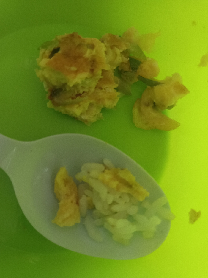 This image depicts an indoor scene in the city of Maleber, Indonesia, showing remnants of a meal. The primary background is a bright, uniform neon-green surface, identified as a plate or bowl. On this surface, a quantity of food is distributed. In the upper-left, a pile of irregularly shaped yellowish food fragments, consistent with scrambled egg or omelet, is present, intermixed with small green vegetable pieces. In the lower-center, a white, opaque plastic spoon contains a portion of white, cooked rice grains combined with additional yellowish food fragments. Smaller, isolated pieces of the yellowish food are scattered across the green surface. No individuals are visible in the scene.