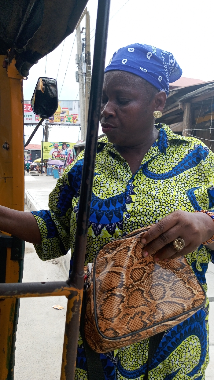 A woman in a blue bandana and colorful yellow and blue patterned shirt stands beside an auto-rickshaw. She holds a snakeskin patterned purse in her hand. The rickshaw's mirror and frame are visible in the foreground. In the background, signs and street activity are seen with people walking and some buildings. The woman wears large gold earrings and a decorative ring.