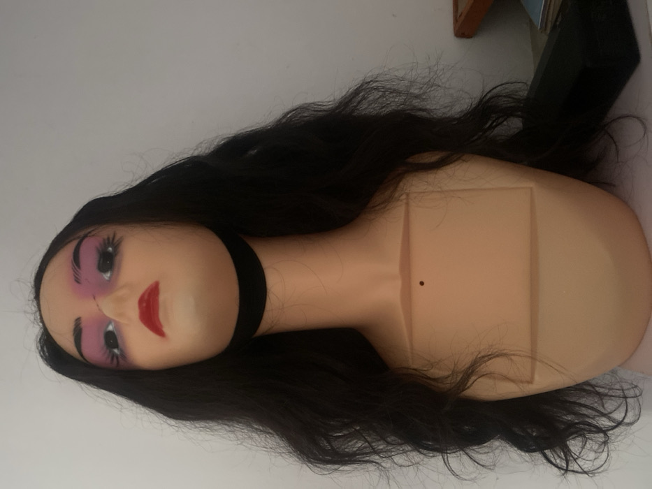 - "A mannequin head with dark, wavy hair sits on a surface" by FM-BPBpZ2, licensed under CC BY 4.0