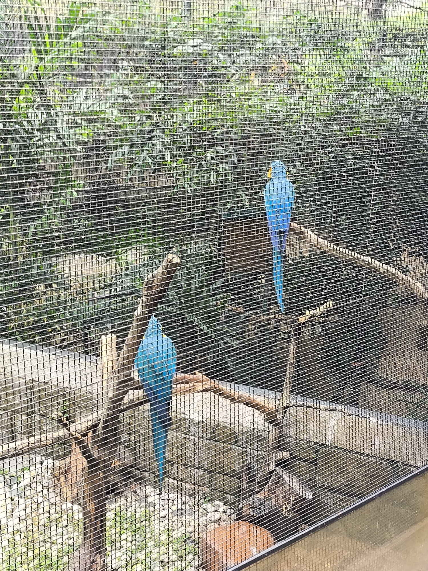 two Spix's macaws in a cage. The birds are primarily blue with yellow facial markings. One bird is perched facing away from the viewer, while the other is visible with its face turned to the side. They are on separate branches within the cage. The background features dense green foliage, suggesting a natural habitat. The cage is constructed of a fine mesh wire. The image may be taken in a bird exhibit, possibly in Hong Kong, China.