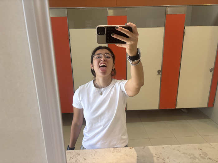 A young woman takes a selfie in a public restroom. She's wearing a white t-shirt, glasses, and multiple bracelets on her left wrist. She's sticking her tongue out and holding her phone up with her right hand. The restroom has orange and white stalls. The floor is tiled, and the counter appears to be light-colored marble. A mirror frame is partially visible on the left. Someone's feet are seen under the stall doors.