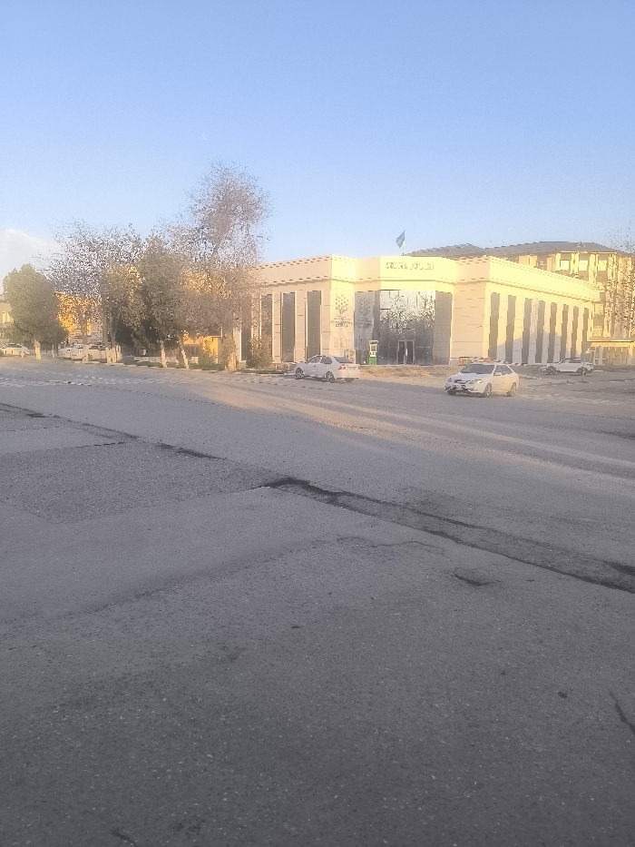 A street scene with a focus on a wide, weathered road surface. In the background stands a distinctive, tan-colored building with a row of evenly spaced vertical columns. A few trees with bare branches line the street. Several white cars are parked or driving near the building. A clear blue sky is overhead, suggesting late afternoon lighting.