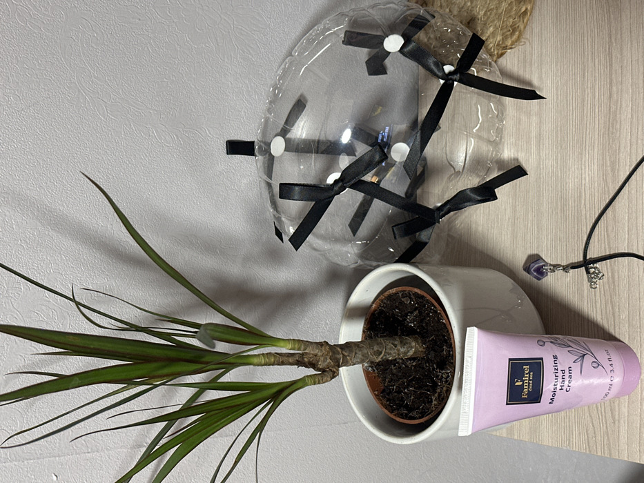 A potted dracaena plant lies on its side next to a clear, spherical package adorned with black ribbon bows