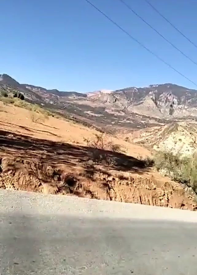 The video captures a landscape view from a moving vehicle. The camera pans across a hilly terrain, characterized by dry, brown earth and sparse vegetation. In the distance, layered mountains rise against a clear, blue sky. Power lines stretch across the top of the frame. A single figure can be briefly seen walking on the hillside. The road is asphalt. A wooden post is visible along the roadside.