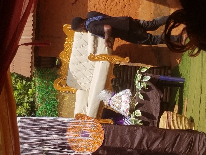 The scene is set outdoors in Ochadam, Nigeria. A male subject, dressed in a dark t-shirt and dark trousers, with a blue patterned fabric draped over his left shoulder, supports a large, ornate sofa featuring a gold-colored frame and cream-colored tufted upholstery. To the left of the sofa, a decorative arrangement includes a white vertical string curtain from which a round, orange, gold, and purple mosaic-patterned disc hangs. Below this, a table covered with a dark brown fabric is adorned with green artificial ivy. On the table rests a basket containing an item wrapped in clear cellophane and tied with a purple ribbon. A light brown woven basket is on the green artificial turf in the lower-left foreground, adjacent to a dark blue cylindrical object. The background consists of an earth-toned wall topped with green foliage and a section of a corrugated metal roof. Overhead, sections of brown and red fabric drapes indicate a temporary canopy. The upper portion of a head with dark, curly hair is partially visible in the lower-right foreground.