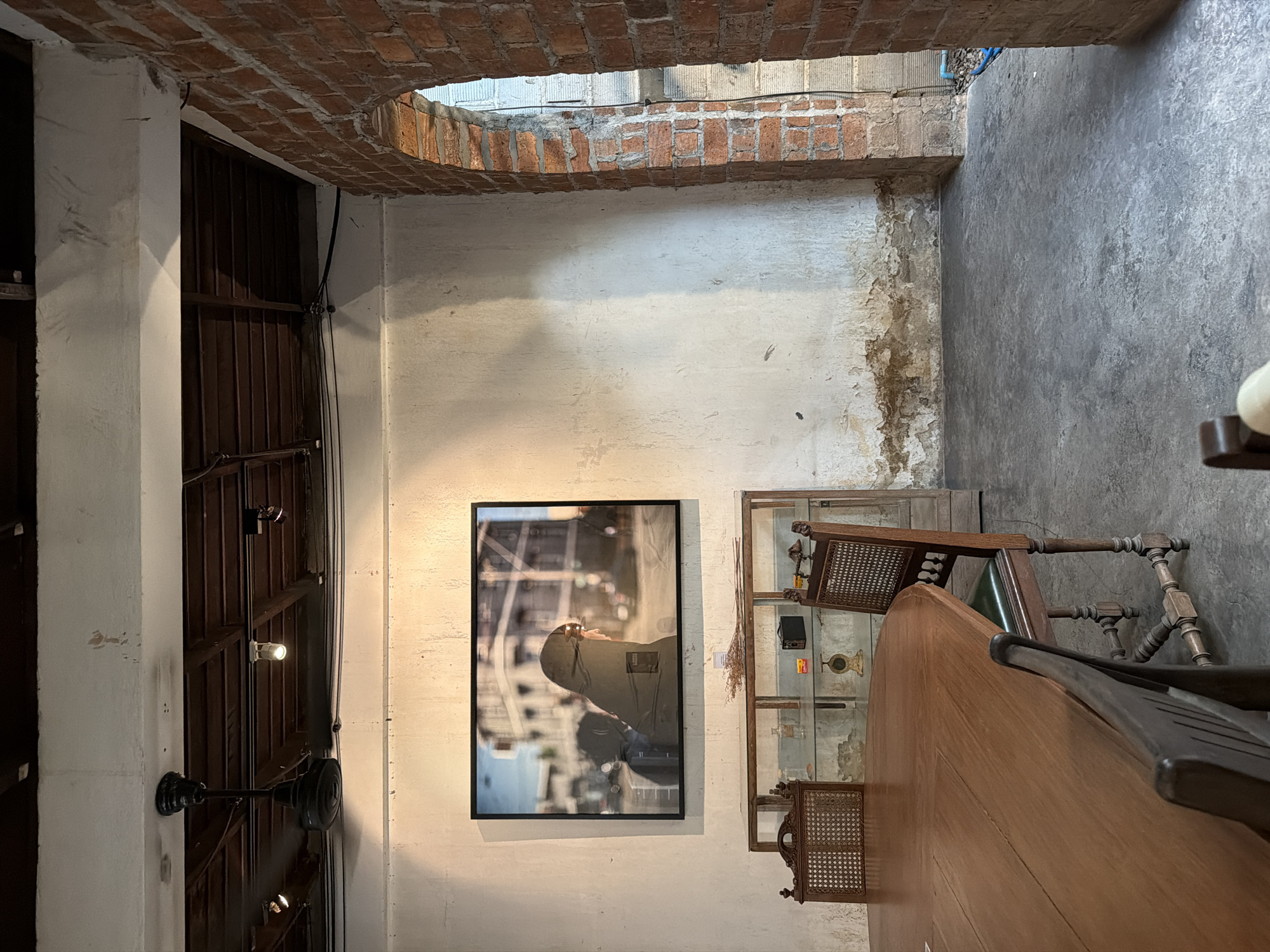 This image displays an unoccupied interior room, identified as being within Chiang Mai City Municipality, Thailand. The floor is dark grey polished concrete. Walls are composed of distressed white plaster on the left and rear, exhibiting peeling and discoloration at the base. The right wall is exposed red brick, forming an archway leading to an adjacent area with a light grey block wall and blue PVC pipes. The ceiling features exposed dark wooden joists and beams, from which a black ceiling fan, multiple track lights, and recessed spotlights are suspended. A large, dark wooden oval table occupies the foreground, partially visible. Surrounding it are several dark wooden chairs, featuring rattan inserts and dark green upholstered seats. Against the rear wall, a wooden-framed glass display cabinet holds various items, including glass bottles, a small golden scale, and red and black rectangular boxes. A small bundle of dried botanical material rests atop the cabinet. Centered above the display cabinet is a large, horizontal framed photographic print depicting a person in profile, wearing a dark hooded garment, set against a blurred urban background with buildings. No individuals are present or engaged in activity within the depicted interior.